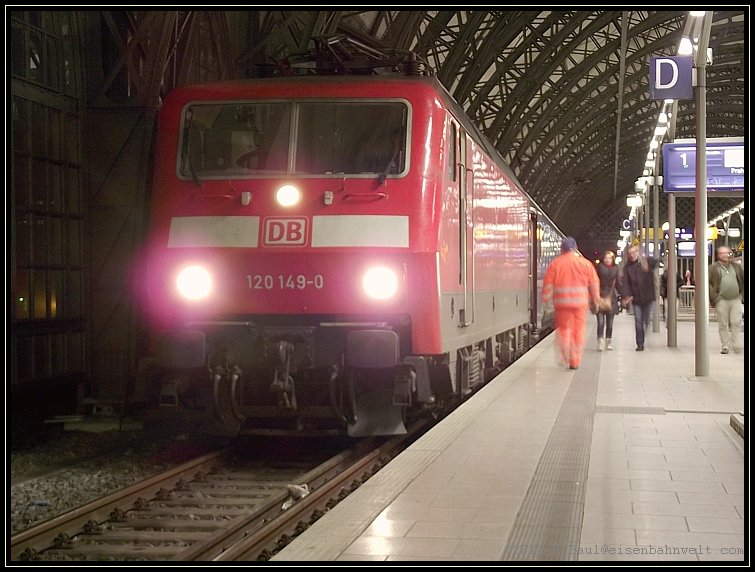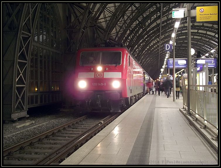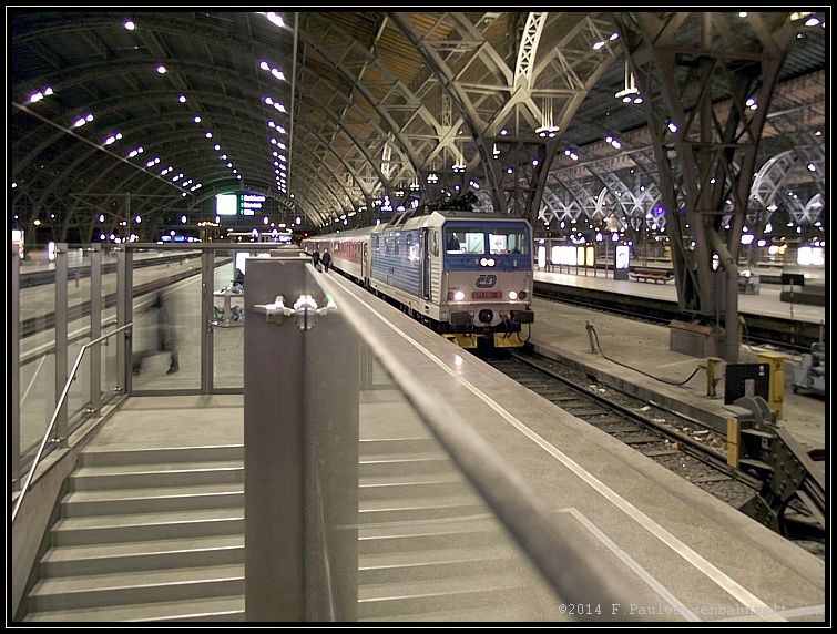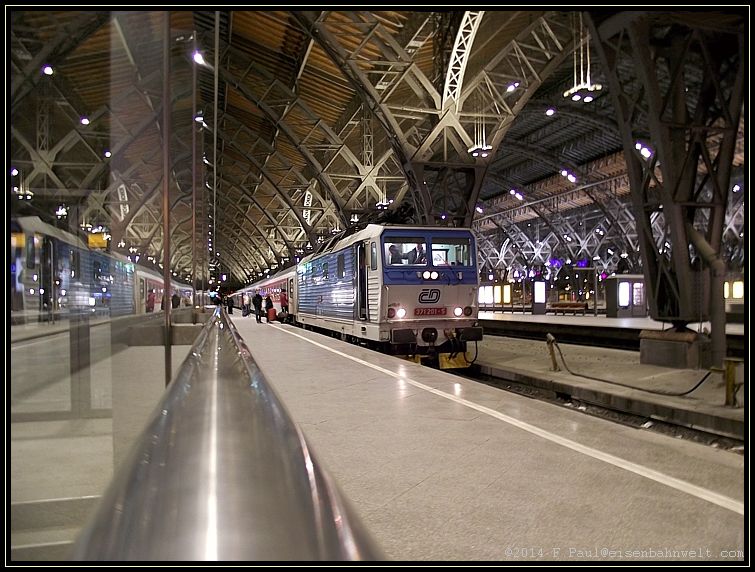 Da fährt auch schon 120 149 mit EC 179 nach Prag mit 13 Minuten Verspätung am Gleis 1 ein. Viele Reisende