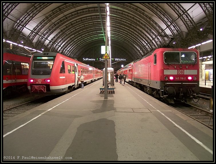 612 610 als RE 17013 nach Görlitz und 143 116 mit RE-D 4778 nach Zwickau. Auf dem rechten Bild gibt es die vier Züge noch einmal von