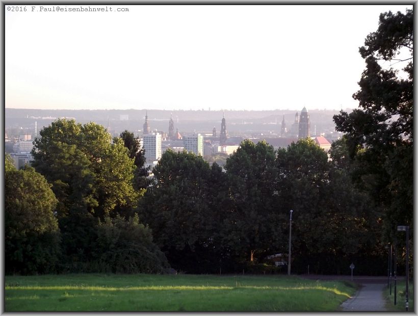 Südhöhe von hinten und genieße für eine Weile das wie immer herrliche Panorama der Innenstadt von Dresden, angestrahlt von der Morgensonne. Aber nun weiter,