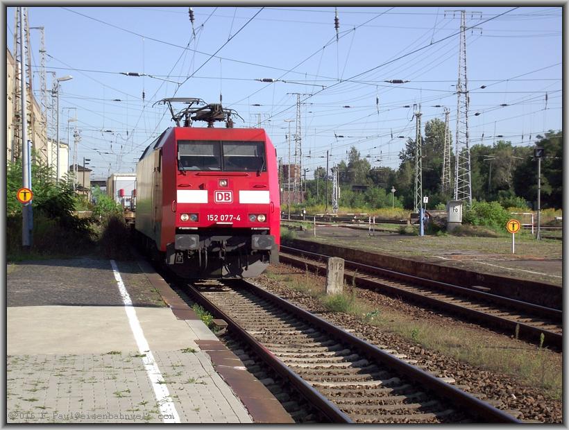 (weiter nach Cottbus ist wegen Bauarbeiten gesperrt) aufbrechen will. Nun aber schnell hinunter nach Gleis 1, wo 152 077 gerade mit KT 41361 (Duisburg Ruhrort
