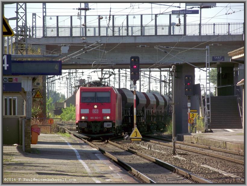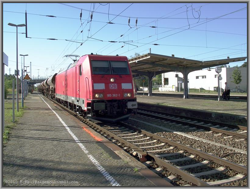 und wenig später nähert sich schon der nächste Zug: 185 362 hat mit dem 2682 Tonnen schweren GB 60842 gerade mit 40 km/h von der Röderauer Strecke auf die