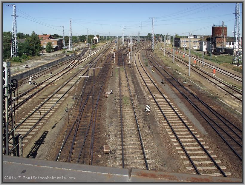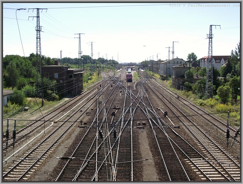 vom unteren Pbf zum Gbf über die Bahngleise führt. Zuerst der Blick nach Norden: Links im Bild die beiden Gleise der anhaltinischen Eisenbahn nach Jüterbog-Berlin,