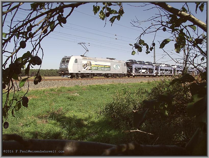 Doch zum Verzehr der saftige Früchte komme ich überhaupt nicht, denn gerade noch rechtzeitig bricht Crossrail-185 594 mit dem Chemikalienzug