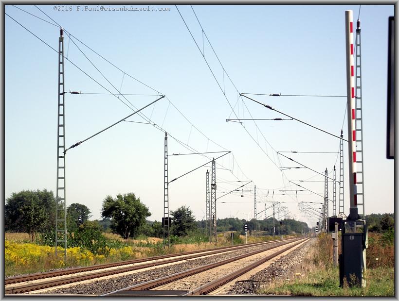nach Falkenberg. Die eigentliche Abzweigstelle liegt allerdings einige Meter weiter südöstlich, erkenntlich an dem Quertragwerk mit dem typischen Betongewicht
