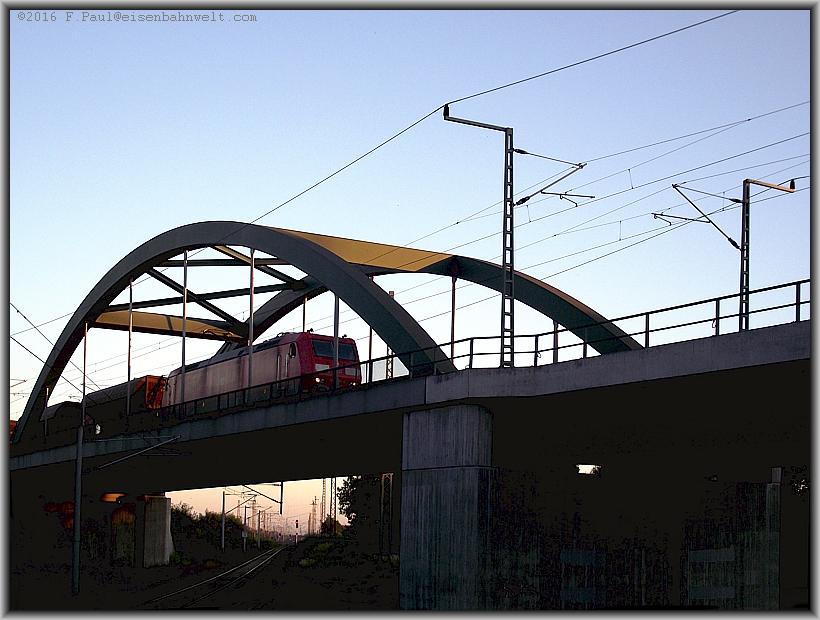 Leider liegt die aus der Mittagszeit bekannte Eisenbahnbrücke nicht mehr im Sonnenlicht, als sie von 186 336 mit GB 60854 befahren wird,