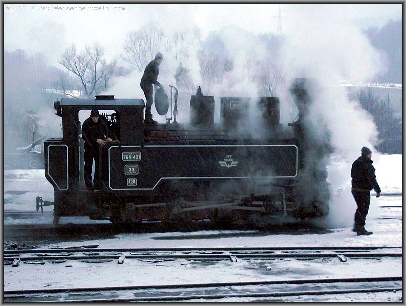 Ungewohnte Geschäftigkeit vor dem Lokschuppen an diesem Sonntagmorgen: 764 421, eine Resita-Lok von 1954, jetzt auch als "Elvetia" bezeichnet,