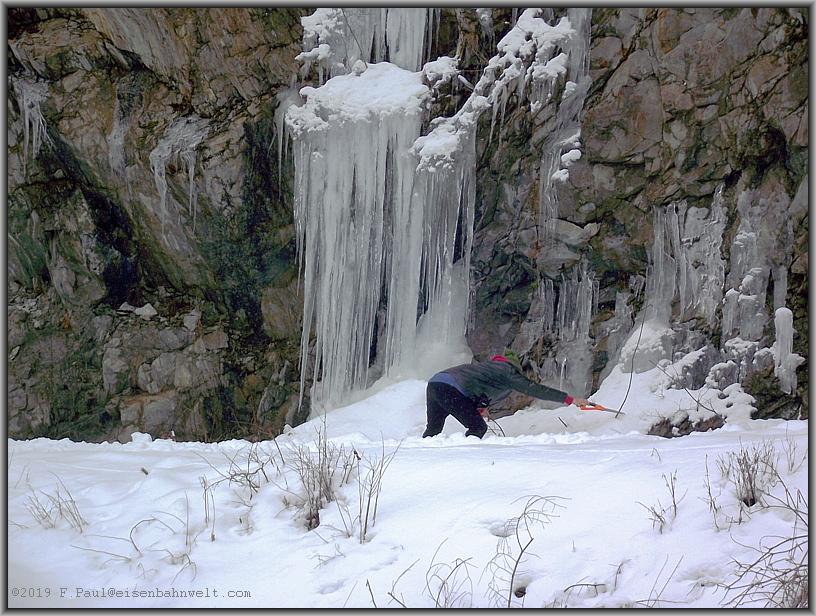 Der nächste Halt des Zuges wartet dann bei Cozia auf uns. Die Natur hat hier einen gewaltigen Waserfall gefrieren lassen, seine aus der Felswand