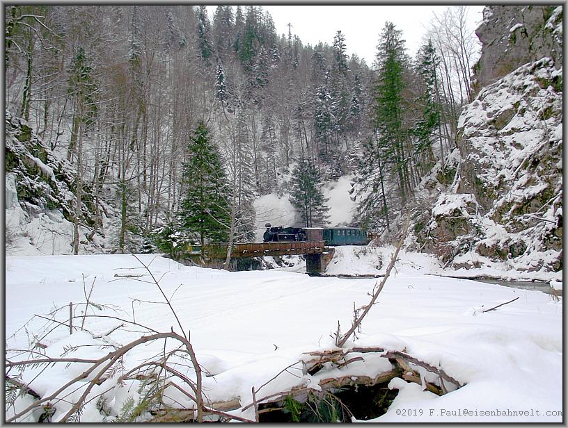 Kurz vor Novicior wechselt das Waldbahngleis wieder einmal auf die andere Flußseite, Gelegenheit für ein paar weitere schöne Winterbilder,