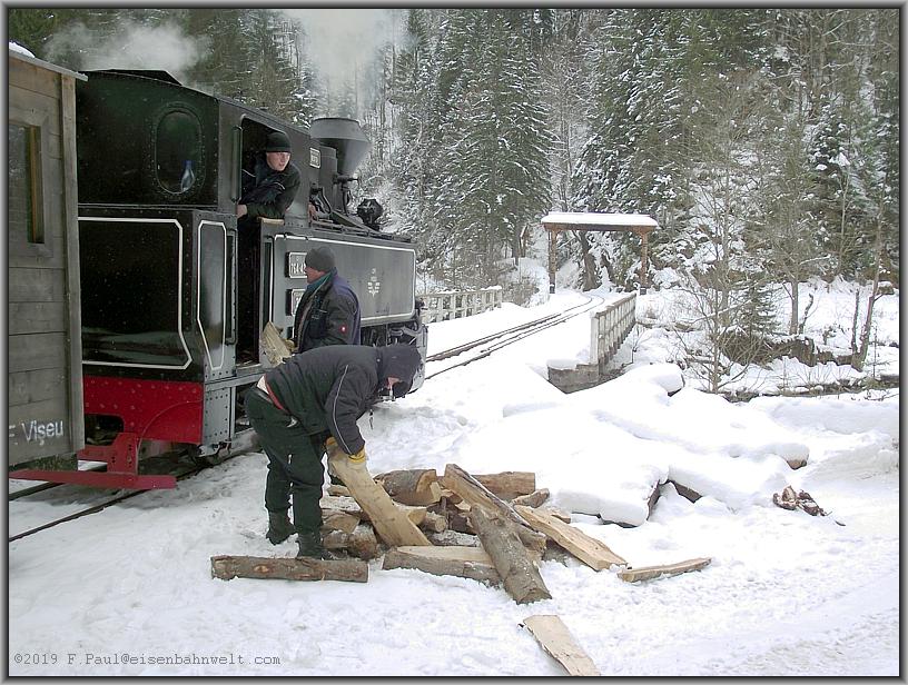 Pause in Glimboca: Zufrieden pafft die Dampflok vor sich hin, während ihr Führerhaus mit neuem Brennholz aus dem Vorratswagen versorgt wird.
