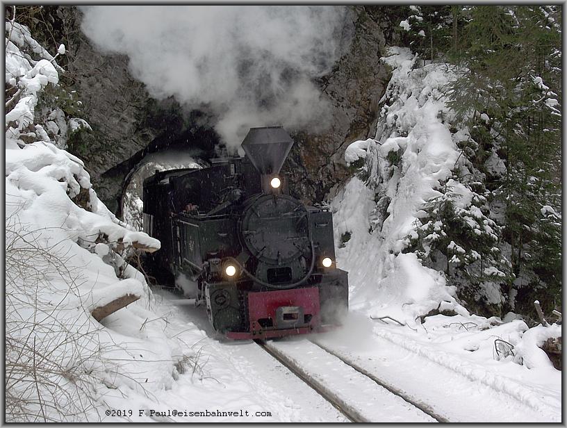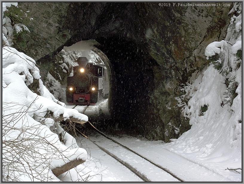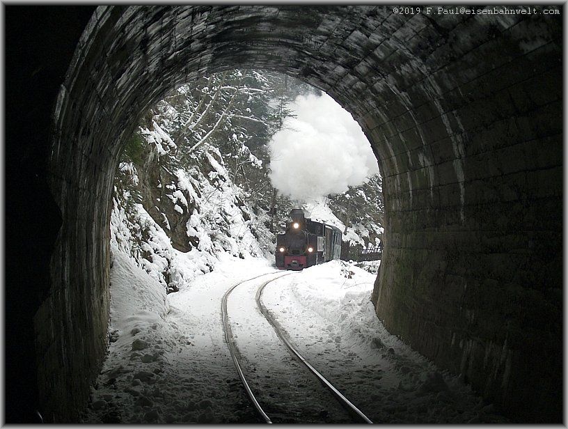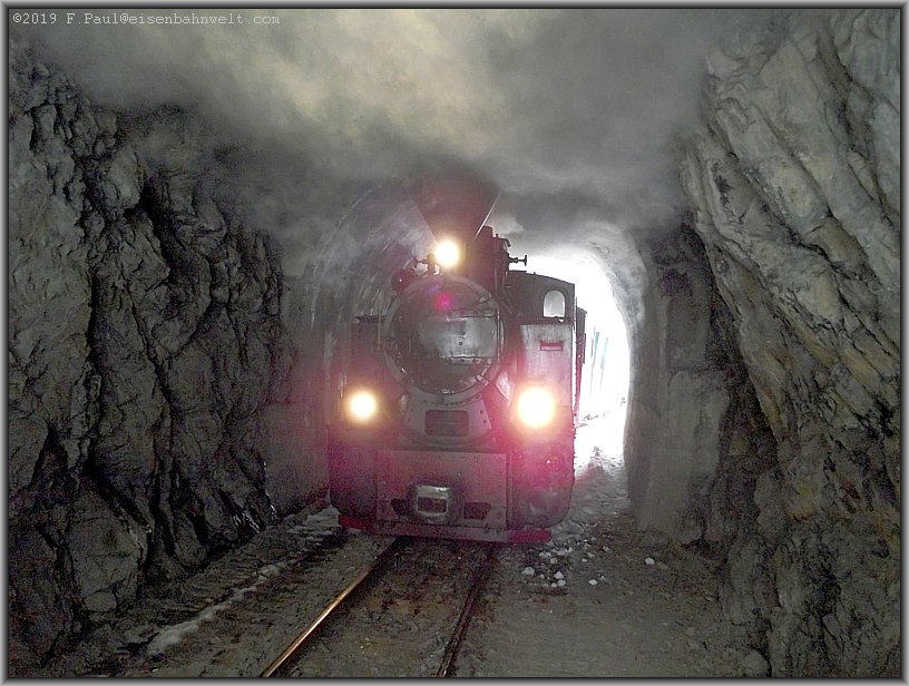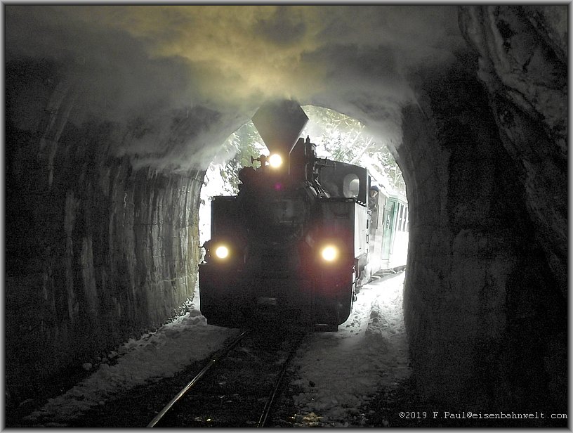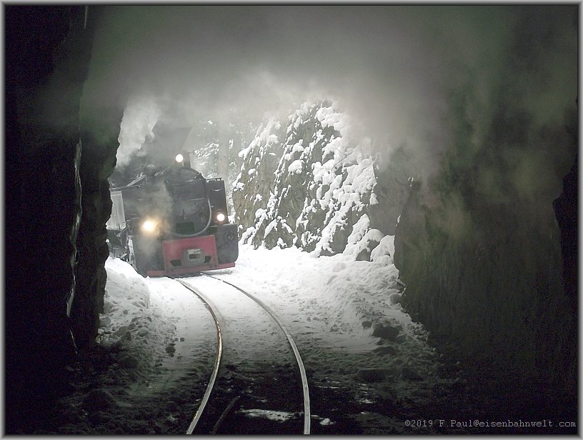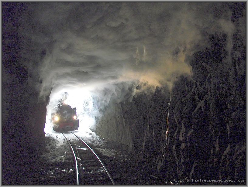 auf und die Ausmauerung der Tunnelwand weicht dem rohen Gestein. Auch hier verbreitet sich der Dampf oberhalb der Lok und bringt die Eiszapfen an der Tunneldecke