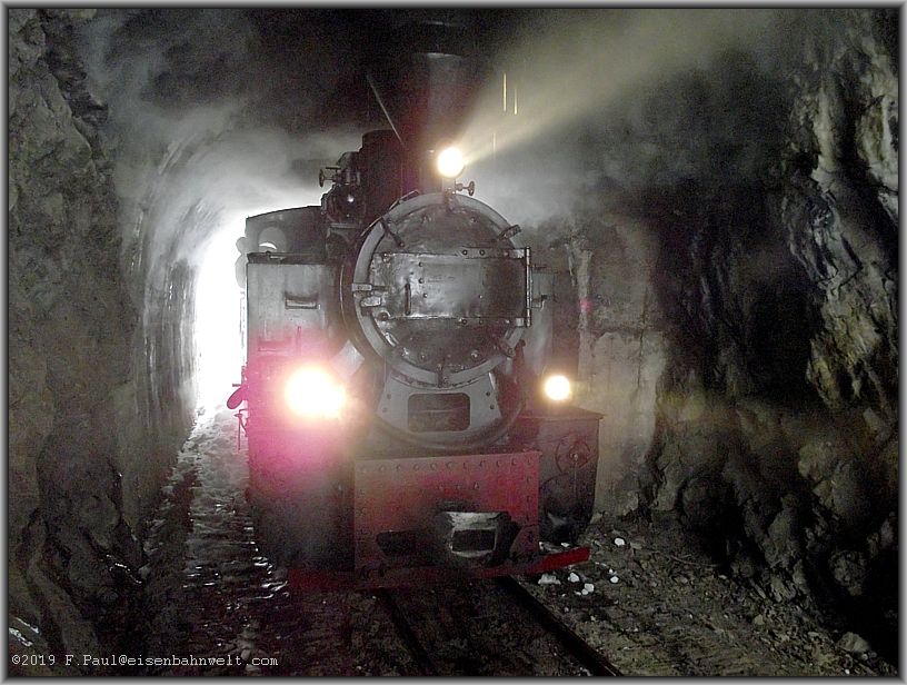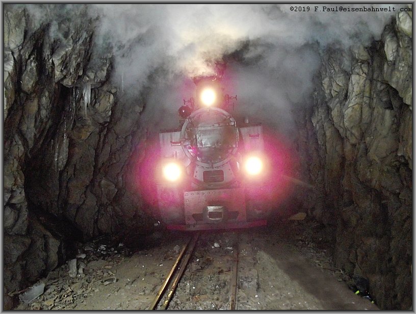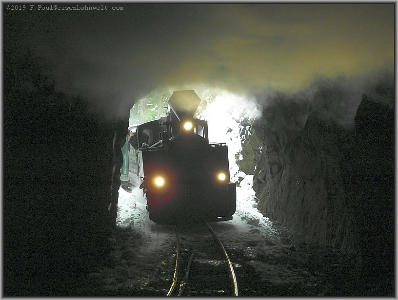 Dann ist der zweite Tunnel erreicht. Ein Hauch von Wind sorgt hier dafür, daß der Rauch der Lok die Tunneldecke räuchert und auch hier
