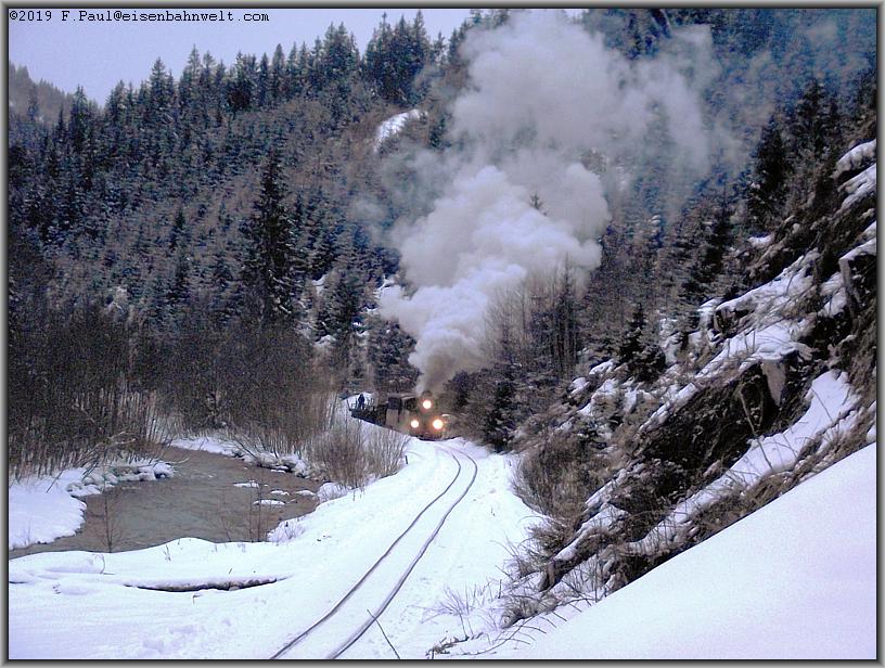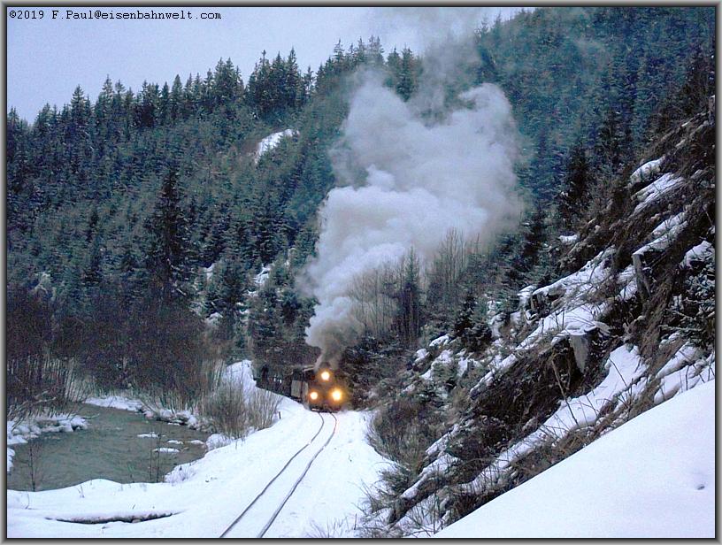 mangels ausreichendem Platz dicht an die Felswand gedrängt, gelingen einige wunderbare Bilder von einer echten Fahrt durch den Winter.