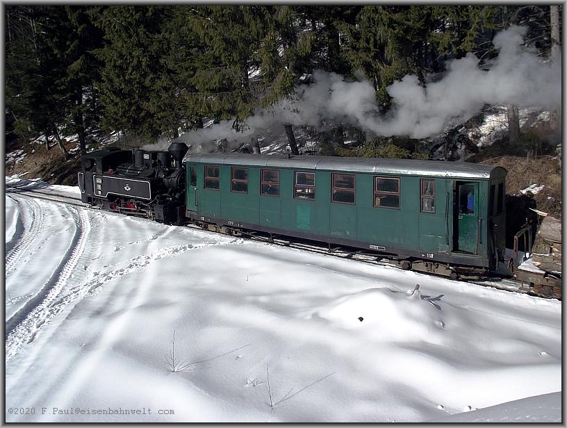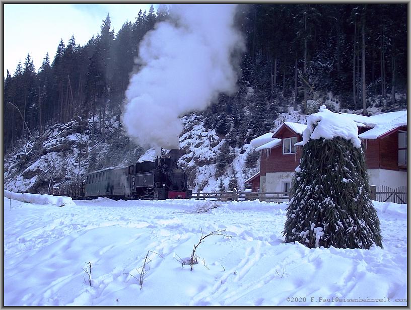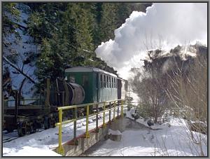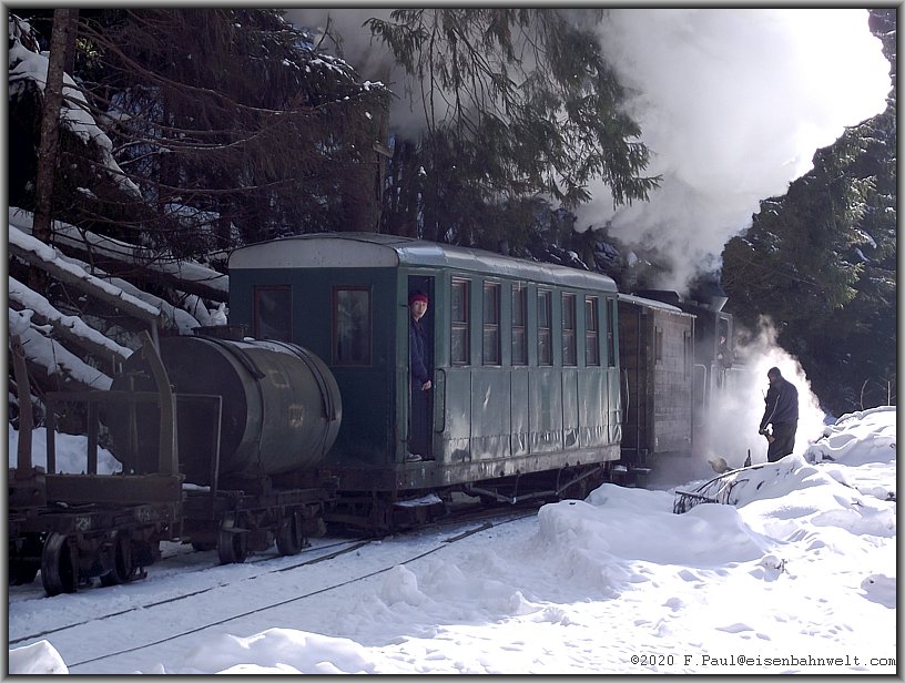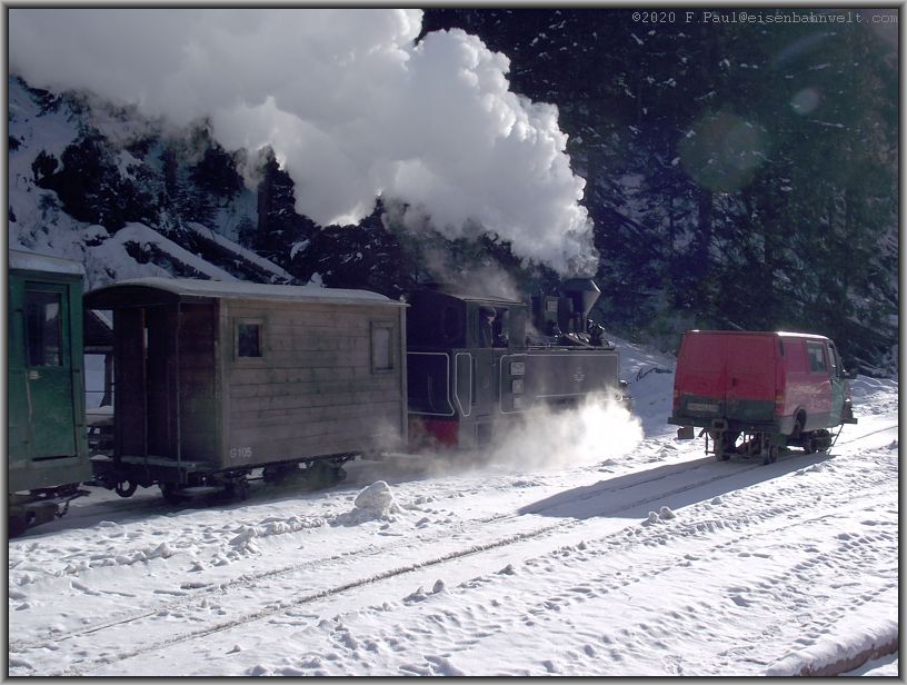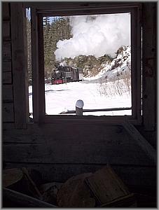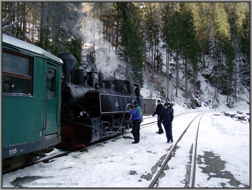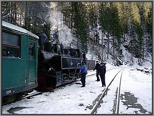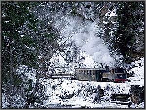 Sonnenschen an dieseer Stelle der Garant für Eiszapfen an den Felsen neben dem Gleis, nur leider lassen sich an diesem Tag keine solche blicken. Und so steigen wir nach nur einer Vorbeifahrt wieder ein....