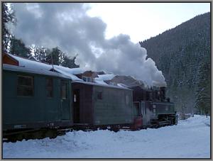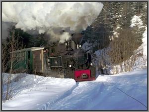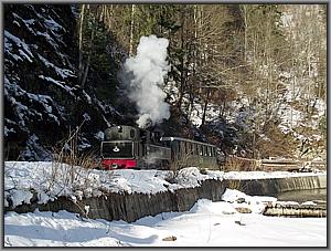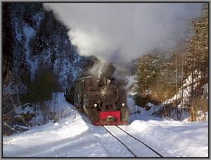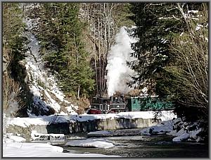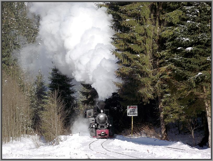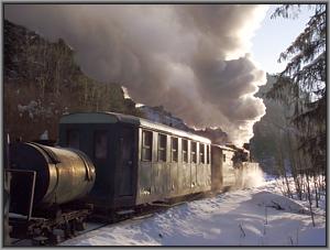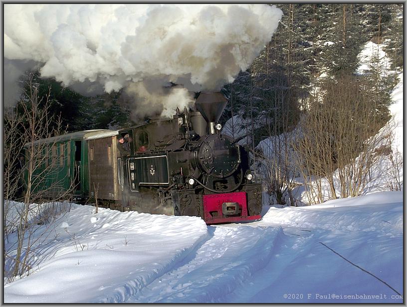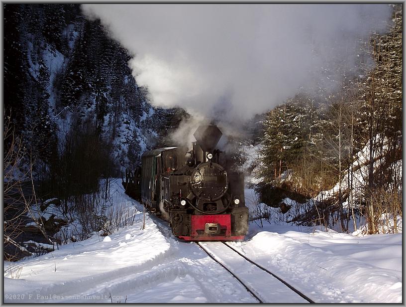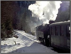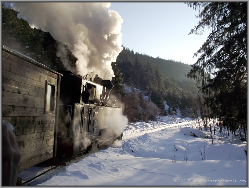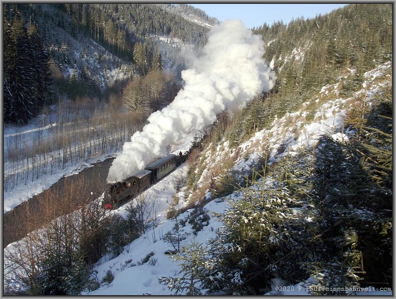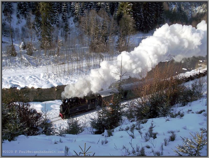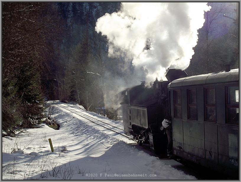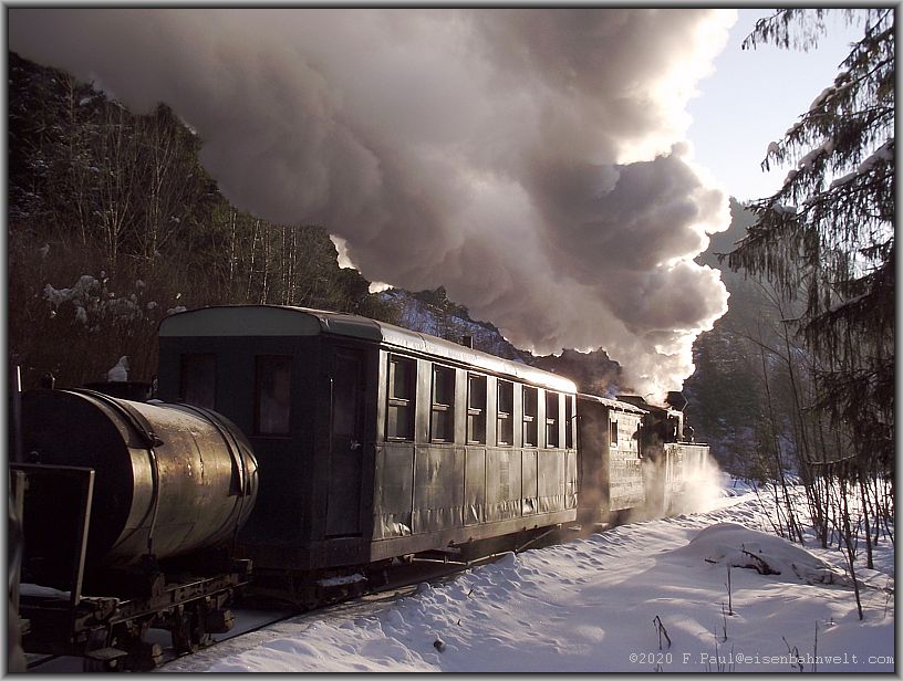 von Licht und Schatten versetzt, auch die Dampflok wechselt immer wieder von besonnten in schattige Abschnitte, dank der recht tief stehenden Wintersonne werden Aufnahmen möglich,