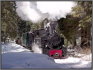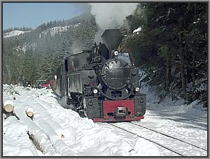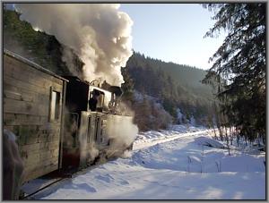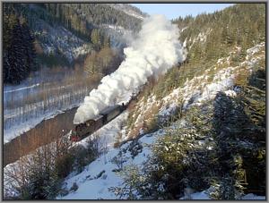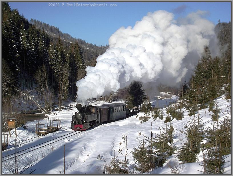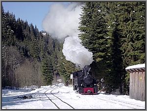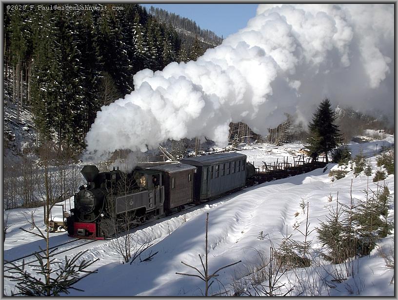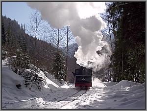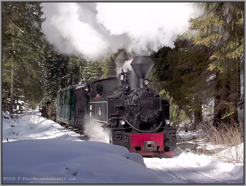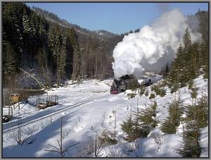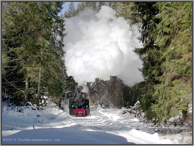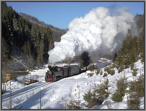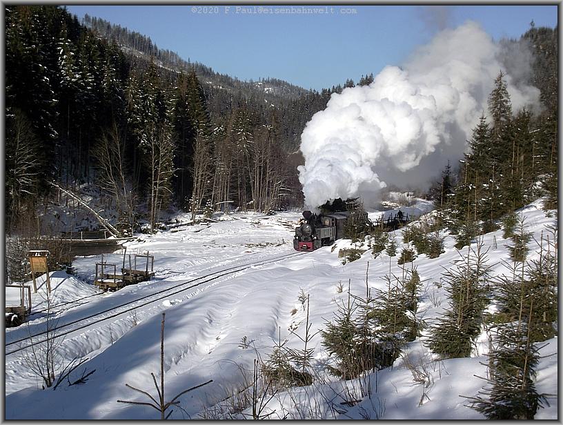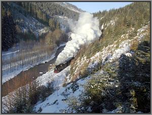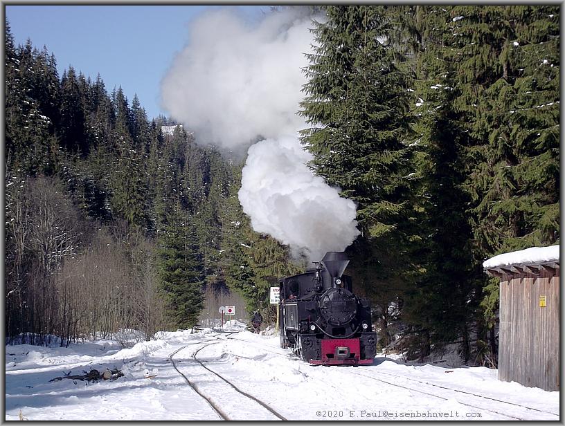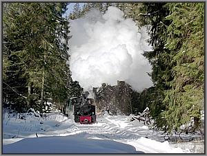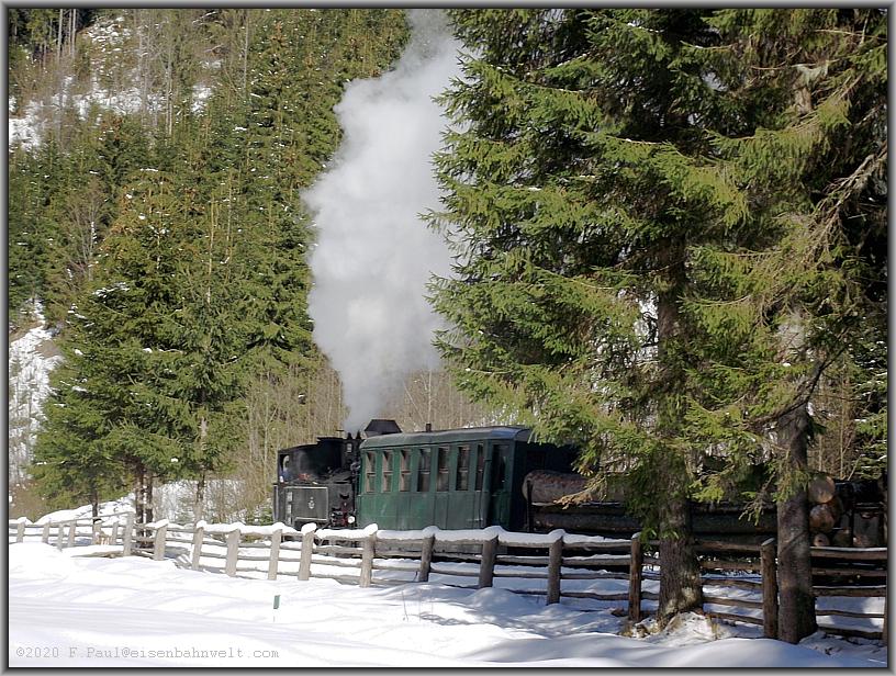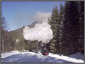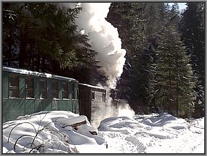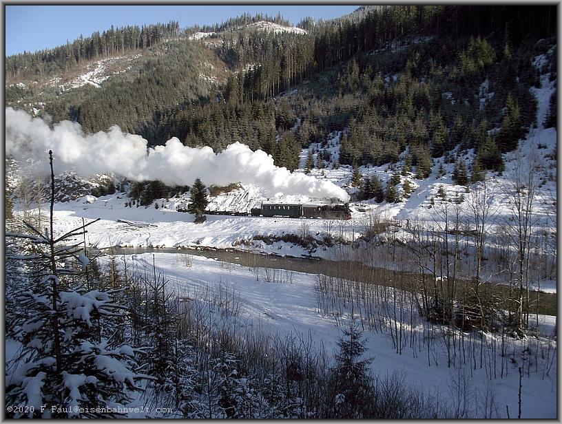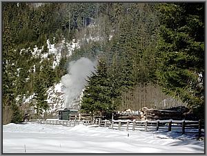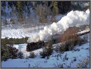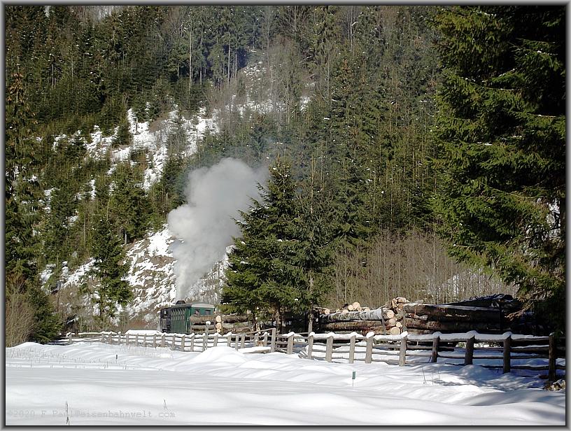 er unten im Tal heran, der Zug! Zuerst eine weiße Wolke über den Fichten, sie kommt näher und unter ihr wird der Blick auf die Dampflok frei, welche sich auf ihrer Bergfahrt ordentlich