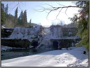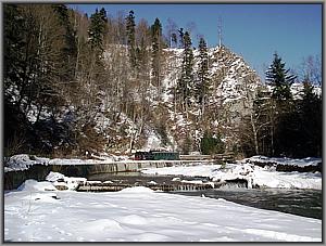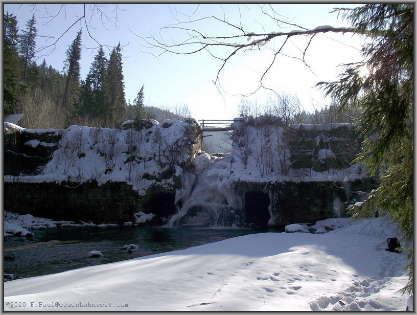 Zwei Bilder der Klause von Macarlau möchte ich noch dazufügen, einmal vom Betonkörper des Bauwerks mit dem von eiskalter Nacht kündenden vereisten Überlauf und dem eisigen Bassin