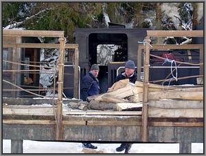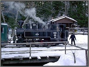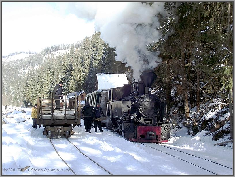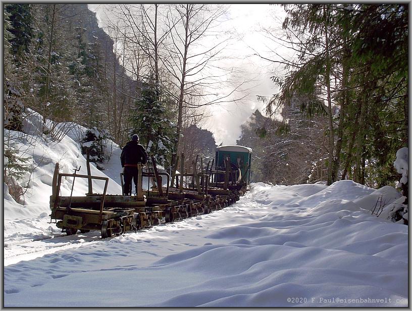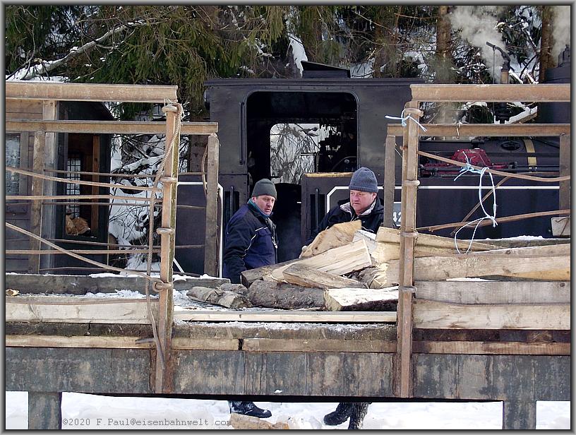 Nach kurzer Fahrt hält der Zug an der im Sommer zur Vorführung vom Holzverlad mit Hand genutzten Rampe. Die tiefverschneiten Stämme zeugen allerdings nicht von einer Benutzung zu Winterzeiten.