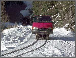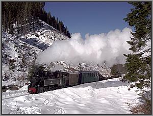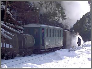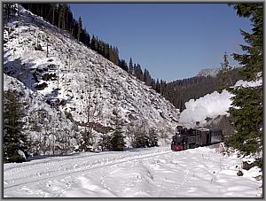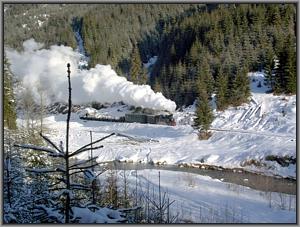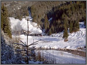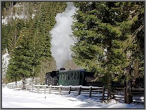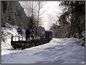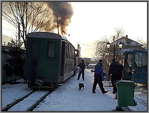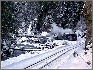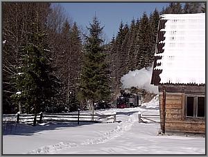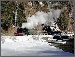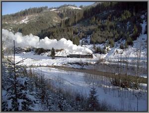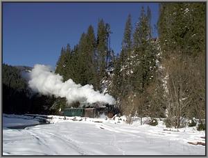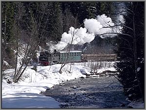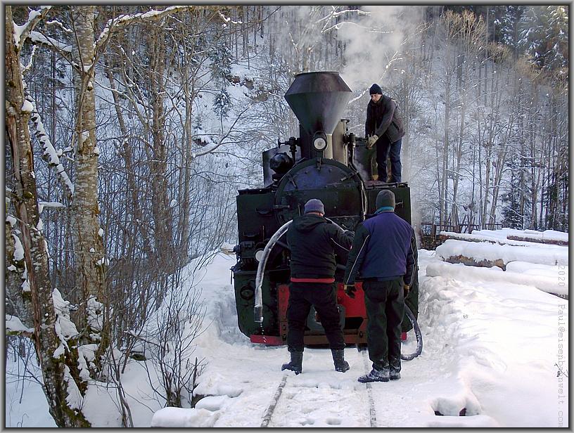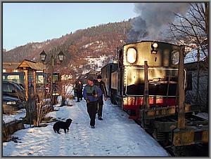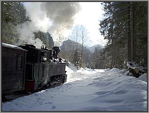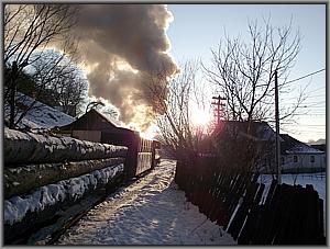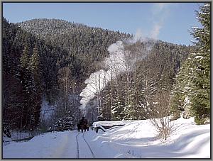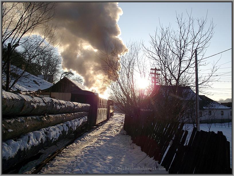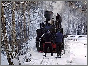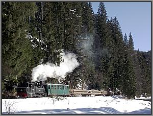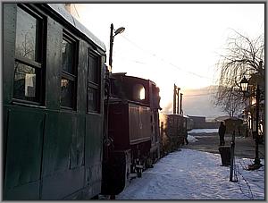 wartenden Holztrucks am Ladegleis von Miraj. Also genießen wir noch einmal die Vorbeifahrt des Zuges in der glitzernden Schneelandschaft, bis es dann endgültig heißt, diesen wunderschönen Ort zu verlassen.