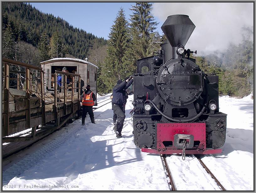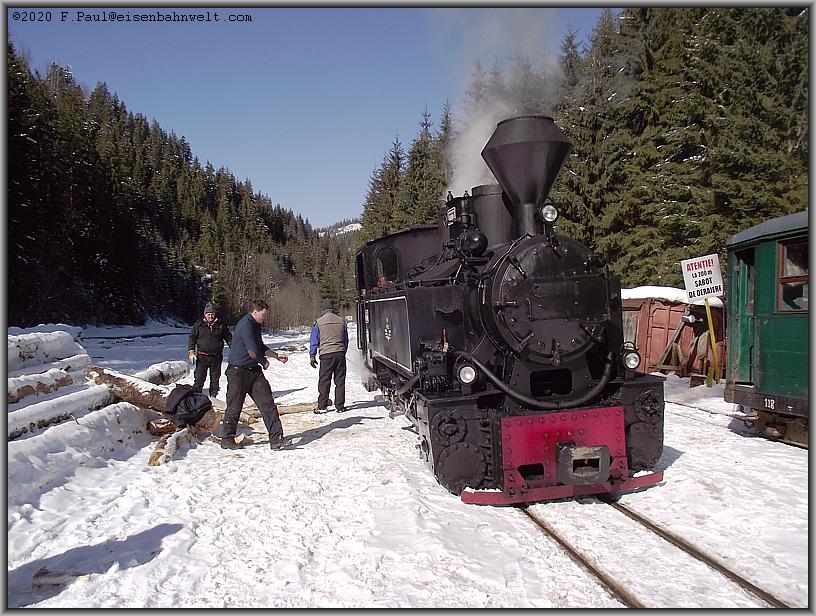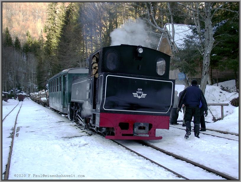 Das Zügle ist nach Valea Babii zurückgerollt, die Lok muss hier umsetzen, denn bis nach Viseu de Sus mit den Wagen voran zu fahren, das ist dann doch ein bißchen zu weit.