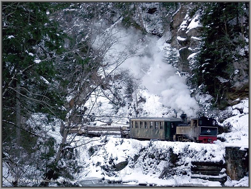 Ziemlich dunkel ist es dann im Talgrund zwischen Botizu und Bardau, kurz hinter den drei Tunneln. Aber auch hier hat die Dampfwolke eine aufhellende Wirkung. Eigentlich ist der fehlende