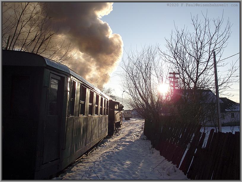 am besten gefallen. Schauen Sie, wie die Strahlen der tiefstehenden Sonne den weißen Dampf durchdringen, während die mitgeführten Leertrucks an uns vorbeischeppern!