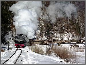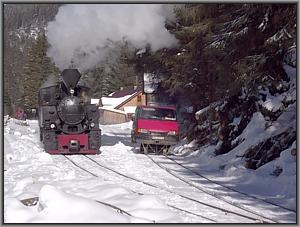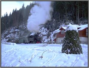 unterhalb der Staumauer und ein zweites von der dampfenden Lok in Warteposition vor dem Dienstgebäude des Weilers. Aber nun weiter nach Gura Stevioara, denn hinter uns wartet schon der erste Produktionszug!
