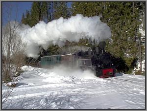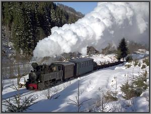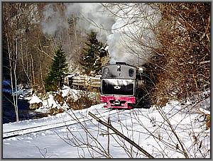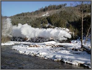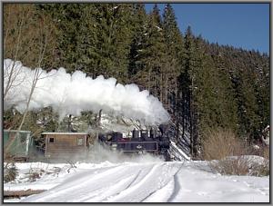 Ist das nicht schön, mitten im Wald? So muss Waldbahn sein! Durch eine Waldlichtung kämft sich der Zug bergan, der ausgestoßene weiße Dampf von den umliegenden Bäumen in eine Orgie