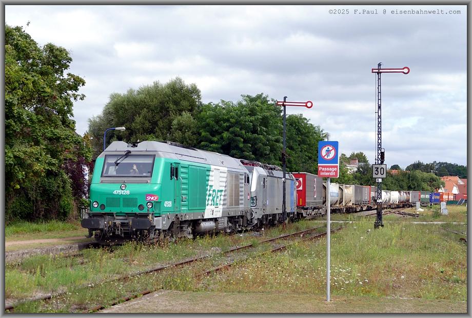 Der erste Güterzug reißt mich aus meinen Gedanken! Die SNCF-Diesellok 475 128 schleicht in den Bahnhof, am Zughaken eine mitgeschleppte 186'er
