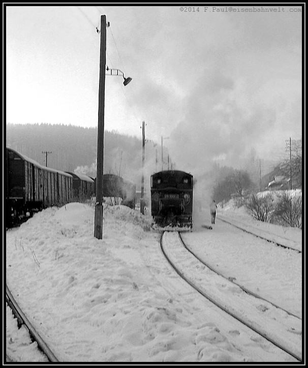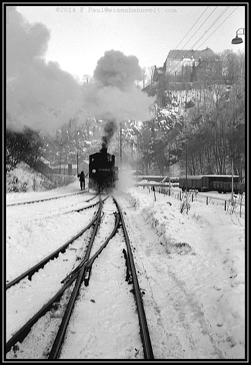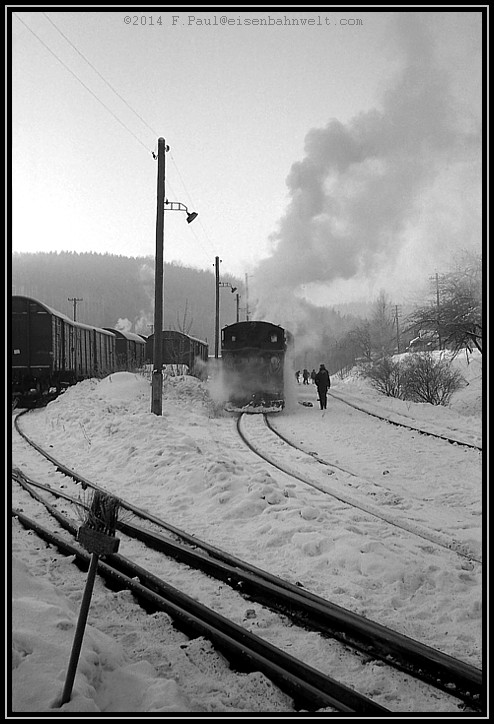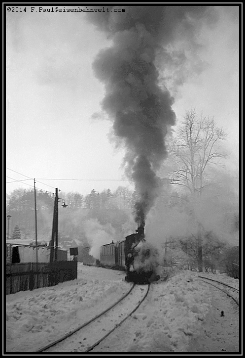 Vom berühmten P 14287 ist noch nichts zu sehen, aber eine Rauchwolke kündet von der Güterzuganlage her von der Ankunft des Nahgüters aus Niederschmiedeberg.