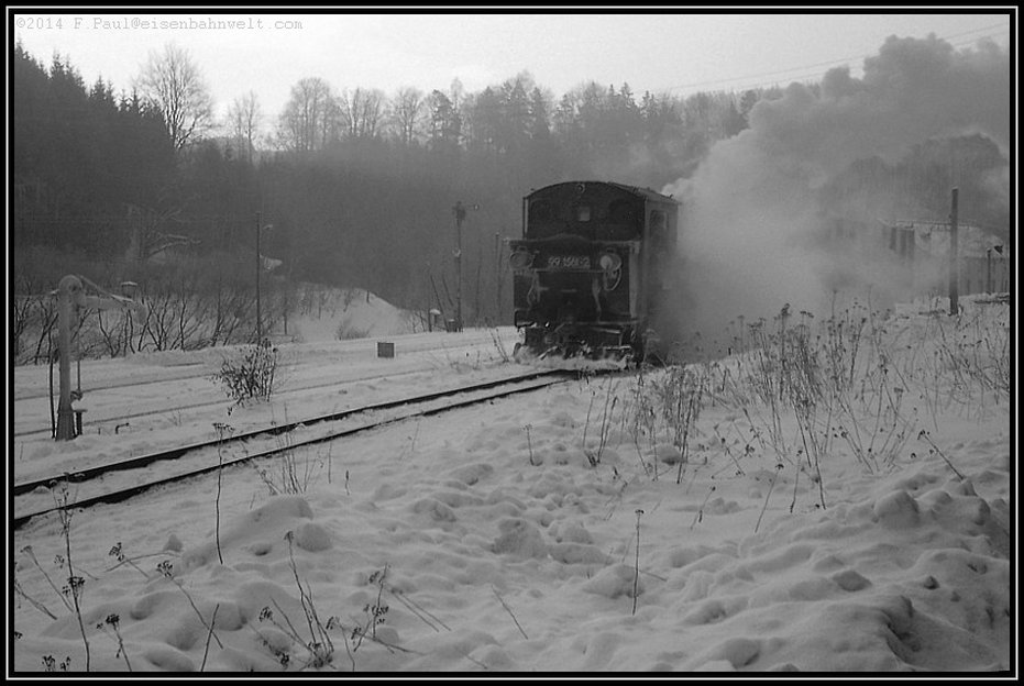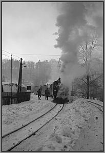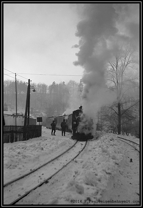 des ersten Personenwagens entern, um sich zusammen mit mir nach Wolkenstein schaukeln zu lassen. Und während die IV k schon mächtig Dampf kocht, tauchen auch die beiden älteren Herrschaften von ihrem Rundgang durch die winterliche