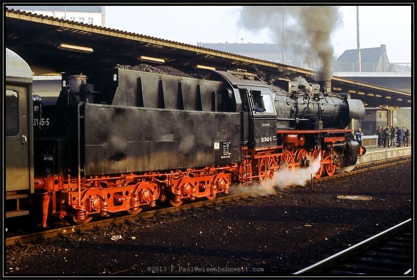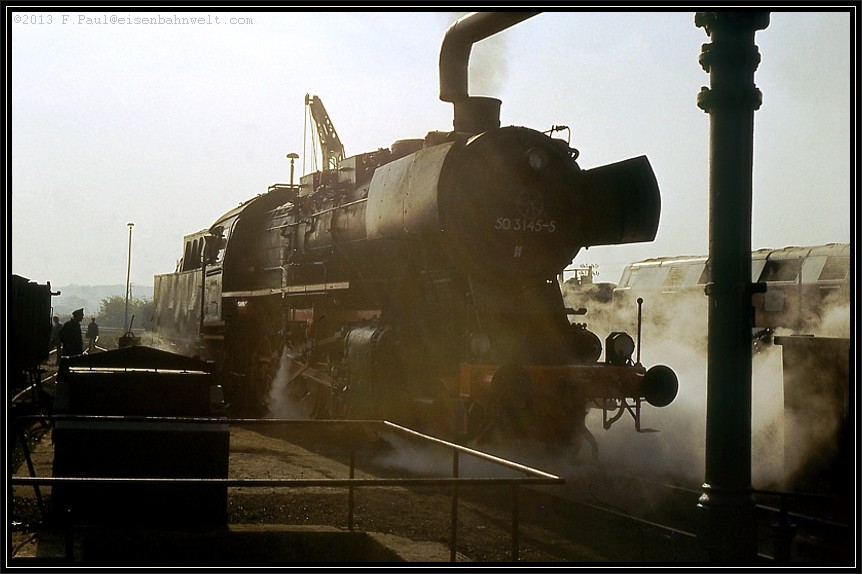 Pause! Zwei Bilder, einmal mit den Personalen, einmal ohne diese! Suchen Sie sich das für Sie schönste Bild heraus! Nur den Kohlenkran gibts nicht vollständig, leider! Dafür aber noch ein Bild von der abgestellten 50 1956, garniert von einer unerkannt gebliebenen 03.2. Schauen Sie dazu HIER! |