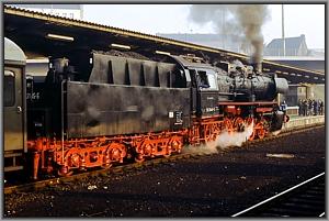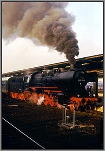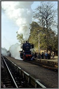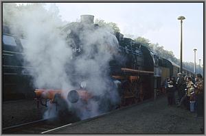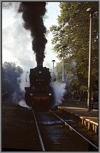 Keiner hindert uns, die Gleise zu überschreiten, um von der anderen Seite her die Scheinanfahrt auf Film zu bannen. Unter atemberaubender Dampf- und Lärmentfaltung bewegt sich die Fuhre im Schrittempo am Bahnsteig entlang, je nach Laune des Heizers donnert der gewaltige Dampfkegel mal weiß oder aber kohlrabenschwarz in den blauen Himmel. |