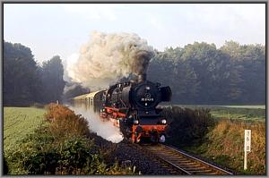 Langsam meldet sich nun unser Magen. Die mitgeführten Kekse sind schon lange, brüderlich geteilt, verdaut worden und haben eine ziemliche Leere hinterlassen. Außerdem will mein "Chauffeur" einige Bilder vom Bahnhof Buckow und den dort auf der gleichnamigen Kleinbahn verkehrenden Triebwagen machen. So gelangen wir über den Weiler Märkische Höhe in die Märkische Schweiz. Ein Bild vom dort bereitstehenden Triebwagen habe ich auch gemacht: HIER ist er zu sehen! Wir finden wenig später eine Gastwirtschaft und nach einem Mittagsmahl dann einen Fotoplatz an der Ostbahn am Hp Obersdorf. Nur ist dieser etwas ungünstig gewählt, die Schatten werden immer länger und beginnen gerade, das Gleisbett zu erreichen, als der Zug dann endlich herandampft. |
