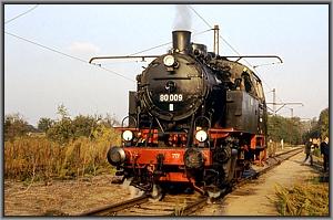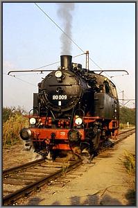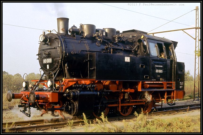 Am 17.10.1981 sonnt sich 80 009 auf dem Kleinbahnteil des Bahnhofs Müncheberg (Mark). Die Lok ist mit ihrem Baujahr 1927 etwas älter als die