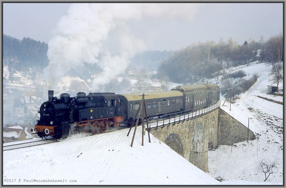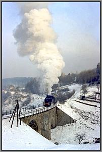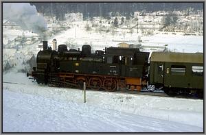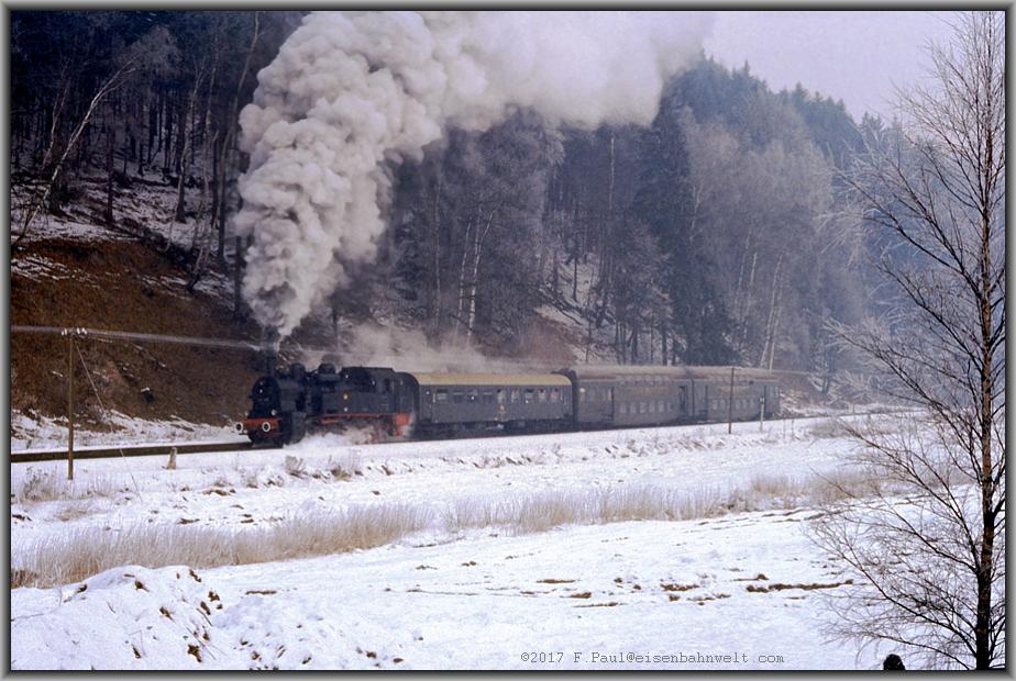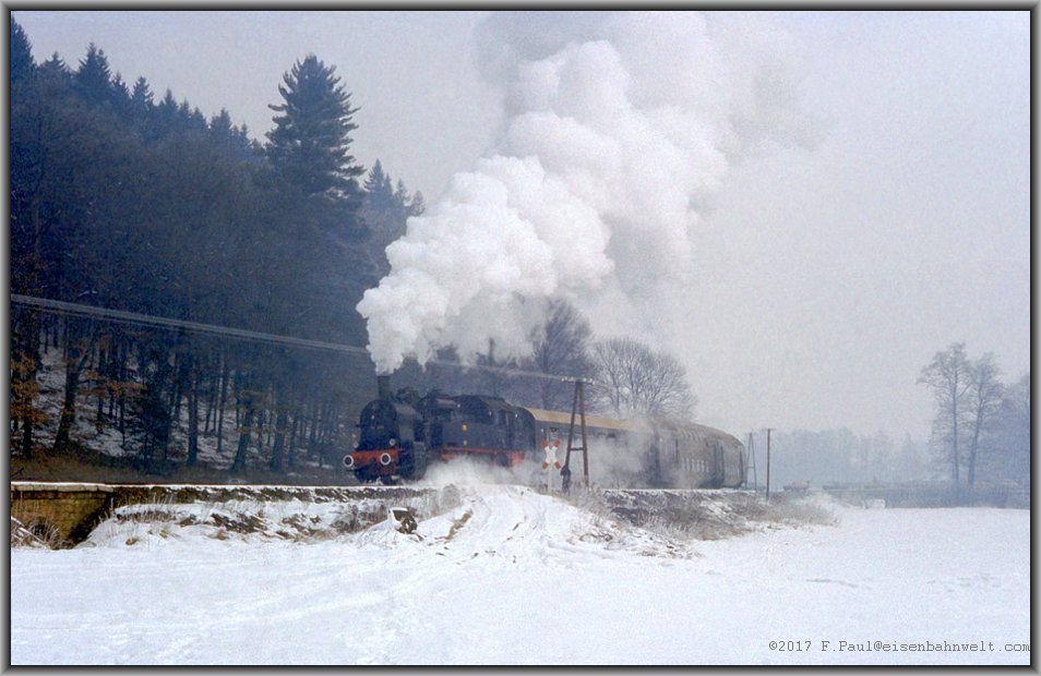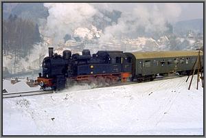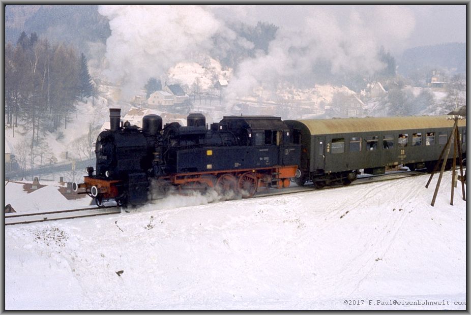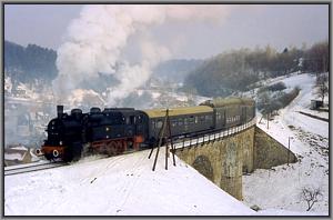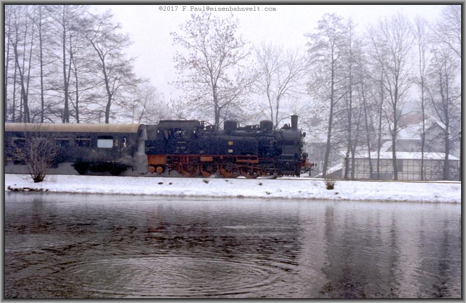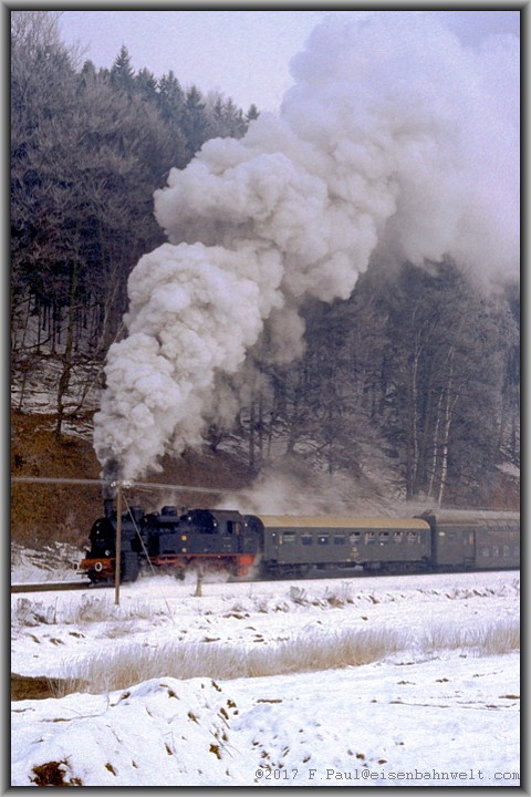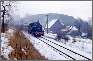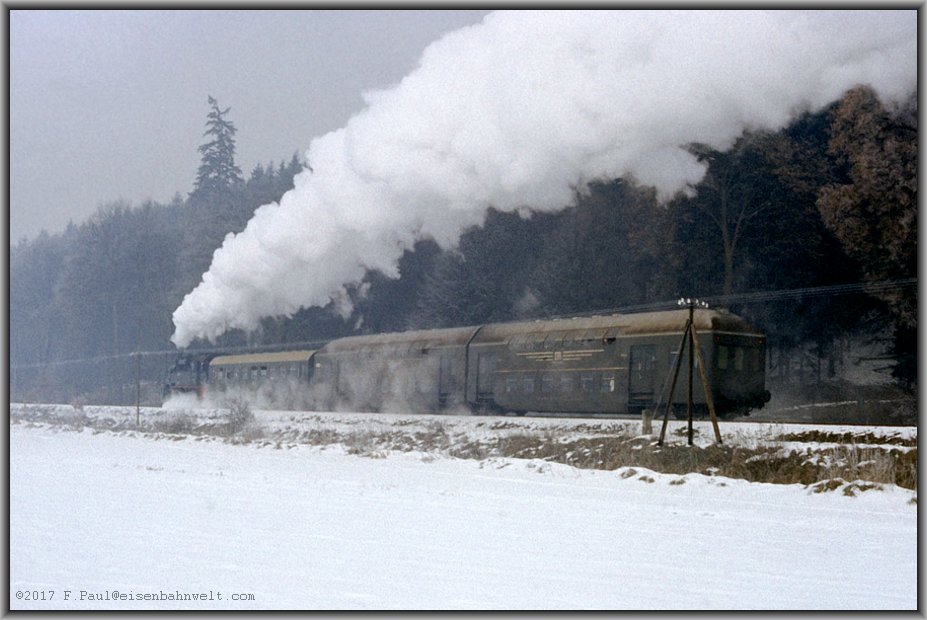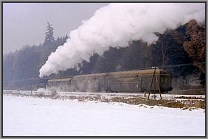 der BR 94 hier mit solchen Garnituren, bestehend aus einer zweiteiligen Doppelstockeinheit und einem Bghw-Wagen, entlang, an kalten Tagen eine Fahne von Dampf