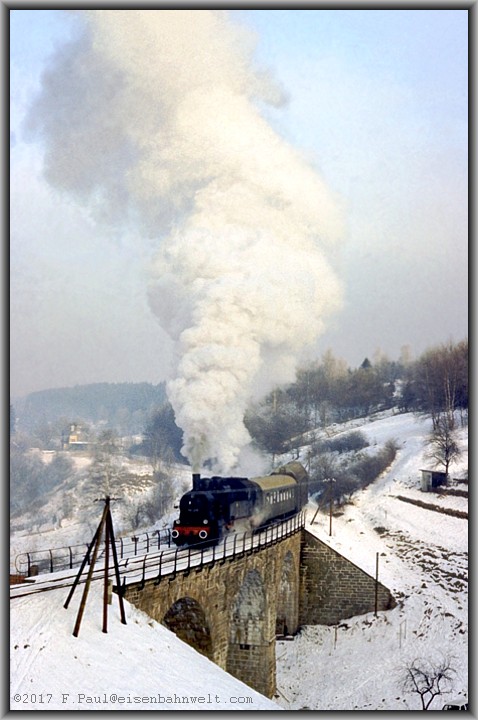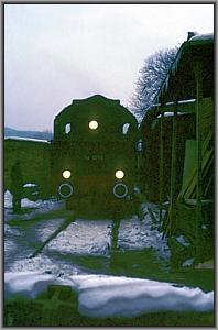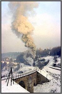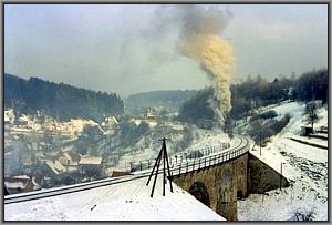 Durch ein weites Tal dampft die Garnitur vor Zollbrück durch den Rauhreif. Schnell die Kamera gedreht, um die Rauchsäule einzufangen. Bei dem diesigen,