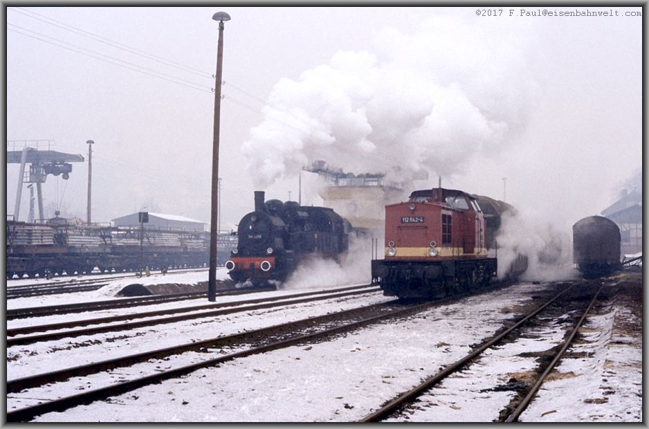 die Dampflok abgekuppelt und rangiert in den Schleusinger Bahnhofsteil herüber, um einer V 100 für die Weiterfahrt nach Erfurt Platz zu machen. Zurückgekehrt auf den
