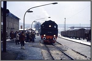 Am frühen Vormittag des 19.02.1983 wird der DMV-Wintersonderzug aus Erfurt in wenigen Minuten dieselbespannt den Bahnhof Suhl erreichen.