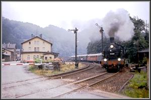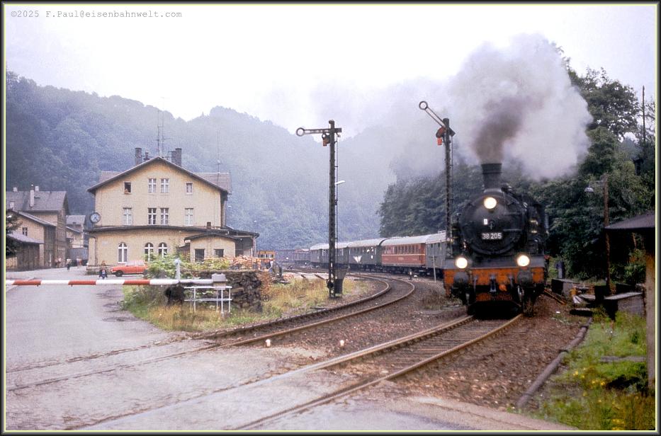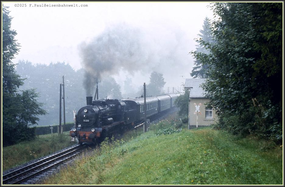 Am 22.08.1983 befördert 38 205 den Intraflug-Sonderzug durch das Erzgebirge. Im Sprühregen verläßt die Garnitur Wolkenstein. Die Fahrtteilnehmer sind
