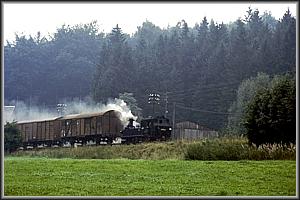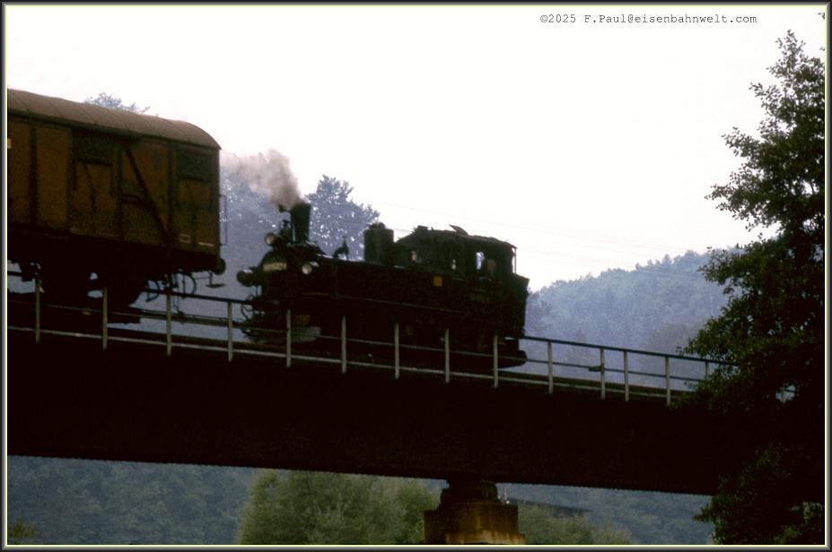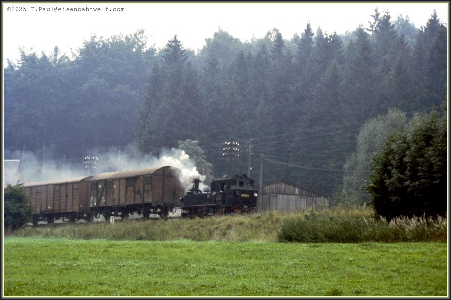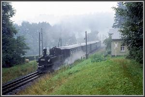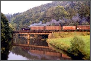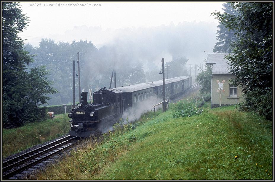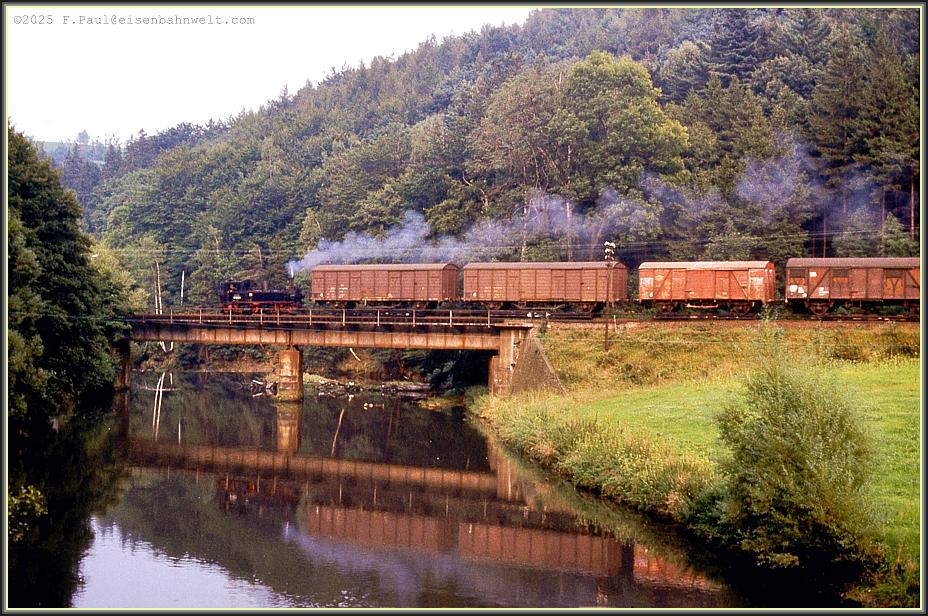Langsam dämmert der Morgen am 22.08.1983 herauf, als sich 99 1582 mit Ng 67920 von Jöhstadt dem Endbahnhof Wolkenstein nähert, am Zughaken die Erzeugnisse des Kühltruhenwerkes