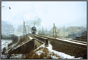 ins Werratal nach Bad Salzungen entschwindenden Zug ist das Gleisdreieck recht gut im Dunst auszumachen.