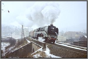 Lok und Wagenzug in die Kurve, um in der dunstigen Kälte das weitere Werratal zu erklimmen und den begeisterten Fans eine sich in den Bäumen langsam auflösende Rauchwolke