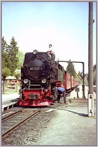 zwischen den Gleisen 1 und 2. Am 30.04.2008 löscht 99 7236 ihren Durst für die Fahrt zum Brocken. Auch auf Gleis 1 können die Loks mit Wasser versorgt werden, 99 7237