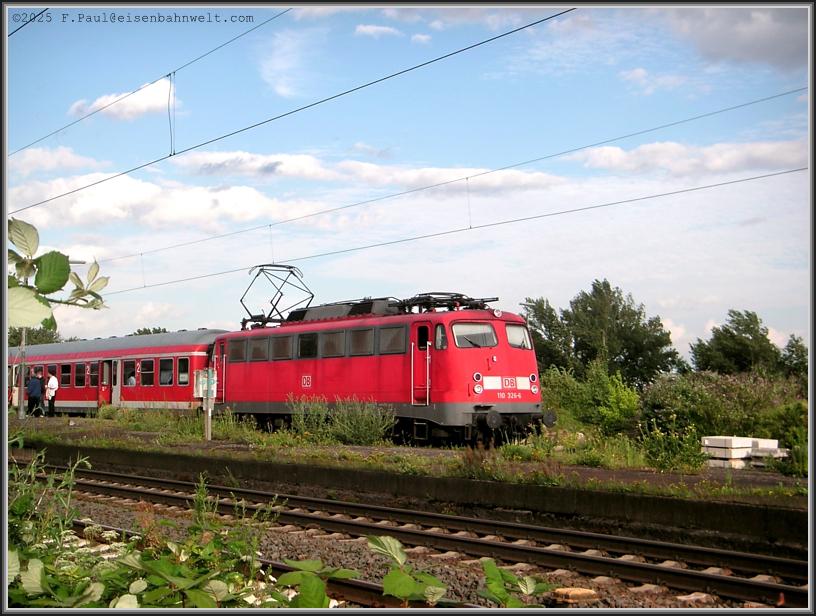Der RE 12134 ist der letzte mit BR 110 bespannte Zug zwischen Frankfurt/M und Mainz. Am 06.07.2007 strande ich mit ihm und 110 326 in Mainz-Gustavsburg.