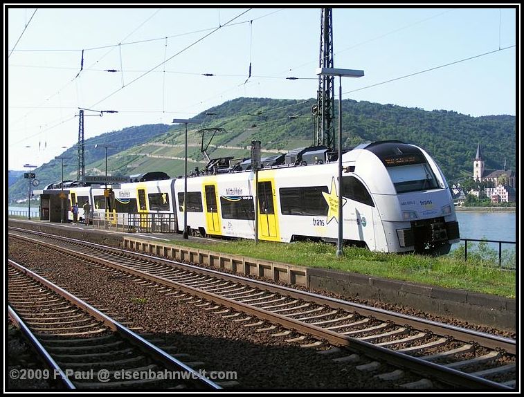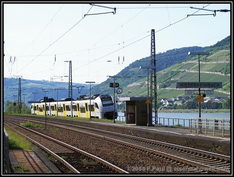 Pünktlich um 17.25 Uhr hält Transregio-Desiro 460 005 als DPN 84146 am 24.05.2009 in Niederheimbach.