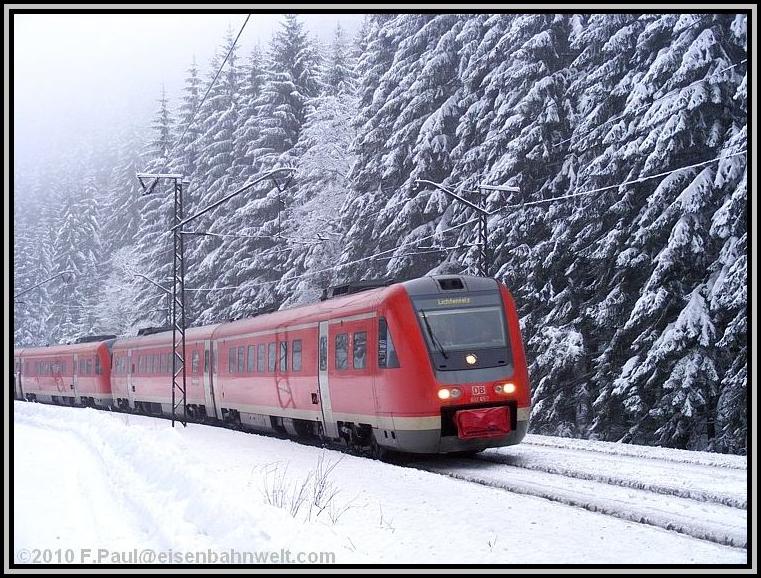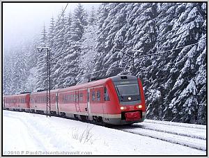 Bergab durchs Haßlachtal nach Förtschendorf rollt am 04.02.2010 die Doppelgarnitur 612 153/653 und 612 090/590 als RE 3485 von Saalfeld nach Lichtenfels durch eine tiefverschneite Landschaft.