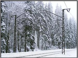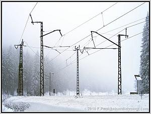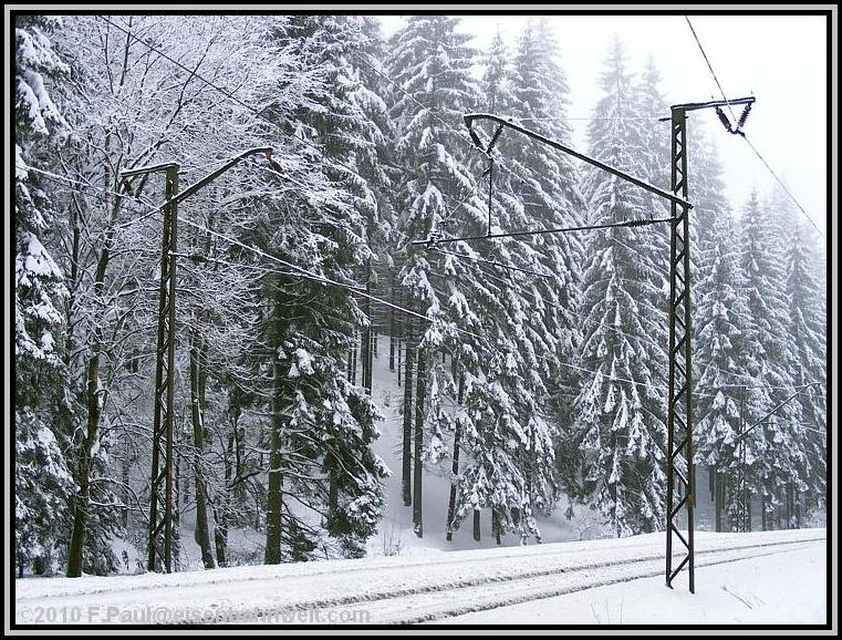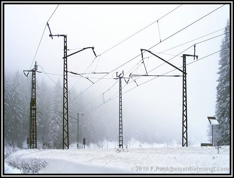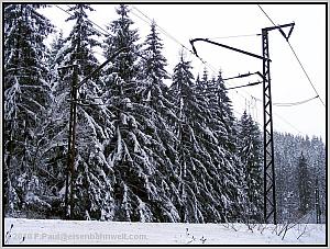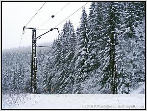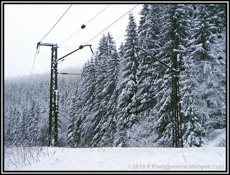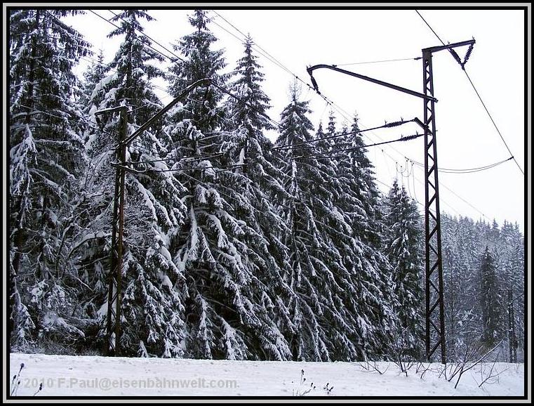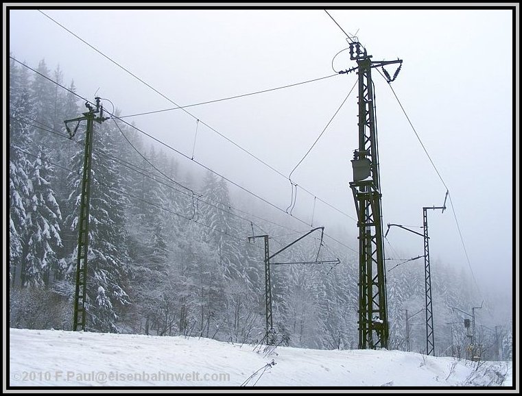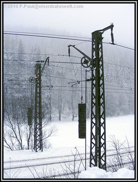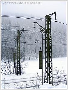 Im engen Haßlachtal zwischen Förtschendorf und Steinbach im Wald funktioniert auch nach über 60 Jahren Dienstzeit am 04.02.2010 noch die alte Oberleitung süddeutscher Bauart von 1938/39 mit filigranen Masten,