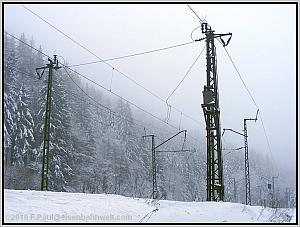 Zum Schluß noch die beiden filigranen Fahrdraht-Radspanner auf der anderen Seite, schneebedeckt. Was werden dafür heute für klobige Betonmasten errichtet! Und ob diese so lange halten, ist noch lange nicht erwiesen. |