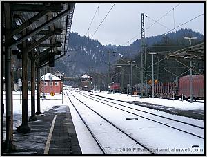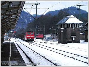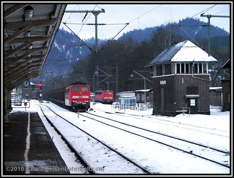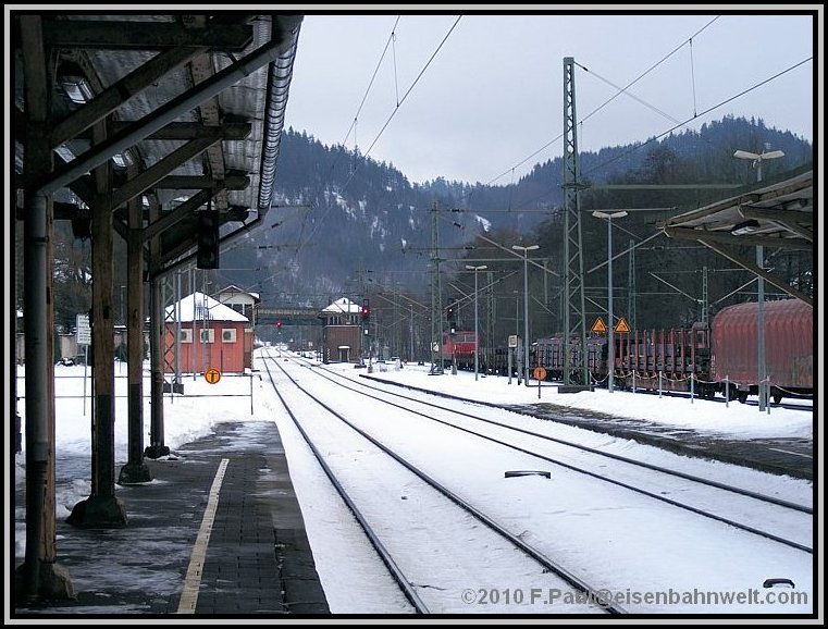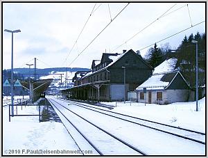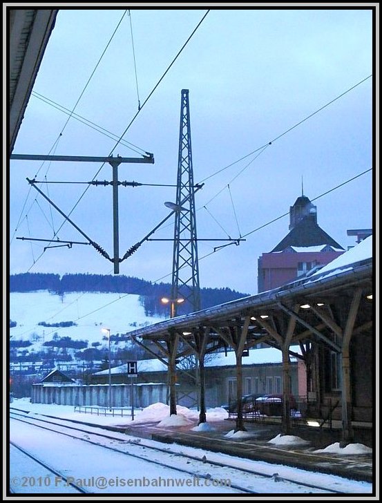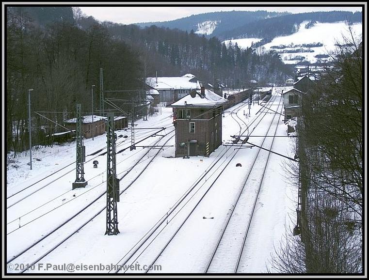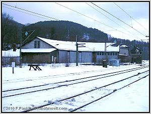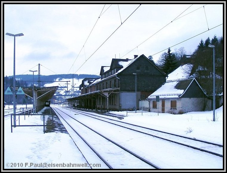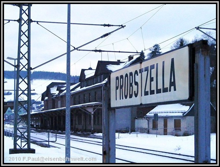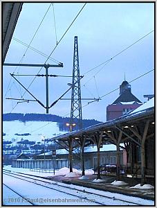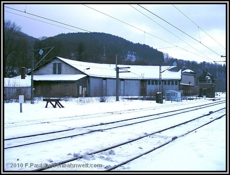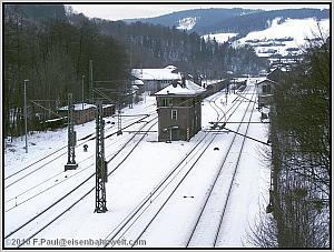 Dem am späten Nachmittag des 04.02.2010 in Probstzella aus der RB von Lichtenfels gestiegenen Reisenden bietet sich beim Zurückschauen ein interessantes Bild: Rechts das Stellwerk "Ps", links hinter der ESTW-Einheit wohl die ehemalige Grenzer-Wachbude.