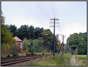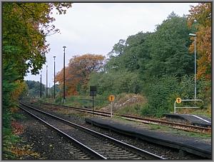 Etwas später hört der Wald auf der Nordseite des Bahnhofs auf und das Überholgleis zweigt vom durchgehenden Hauptgleis ab. Stellwerk W 2 überwacht diese Seite des Bahnhofs. |